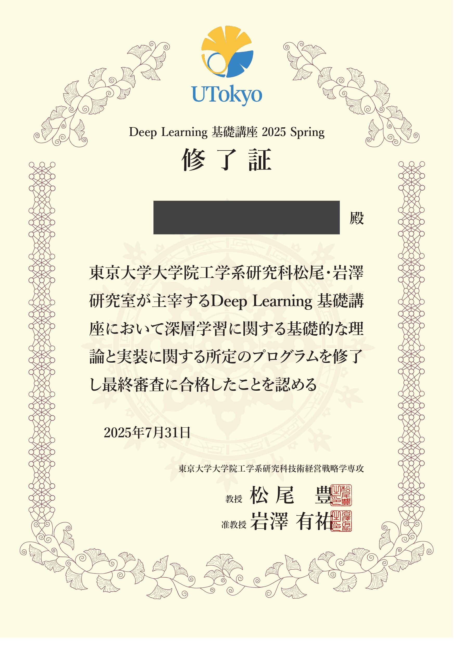 このたび、東京大学 松尾研究室の「Deep Learning基礎講座 2025 Spring(2025.07修了)」と「深層生成モデル講座 2025 Summer(2025.10修了)」の2講座を修了しました!!