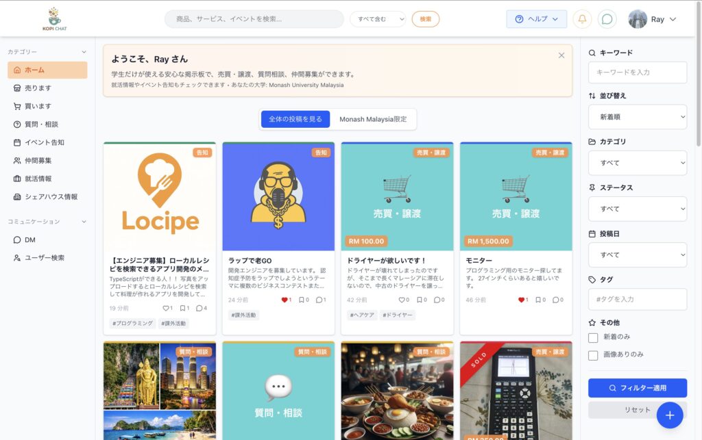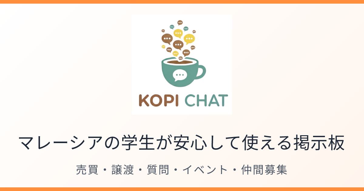 Kopi Chatは、「マレーシアで学ぶ学生が、安心して使える掲示板」を目指しています。