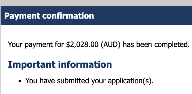 提出ができた後はすぐにお金を払う必要があります。現在は2000オーストラリアドルがかかるそうです。いい商売ですね。