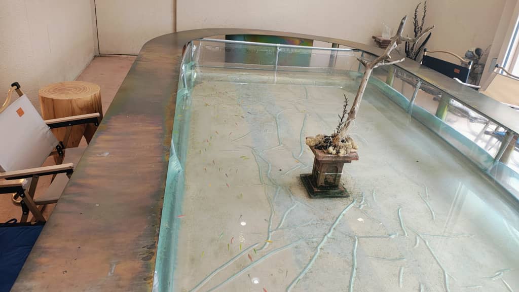 青と魚がテーマのカフェ。店内にはカラフルな生きた魚を捕まえて持ち帰ることができる場所があります。