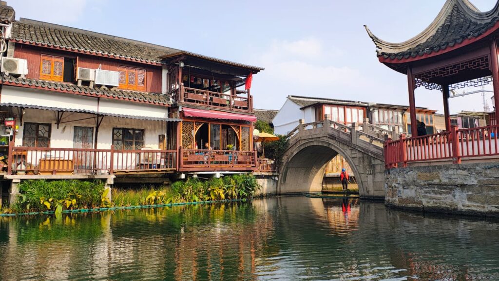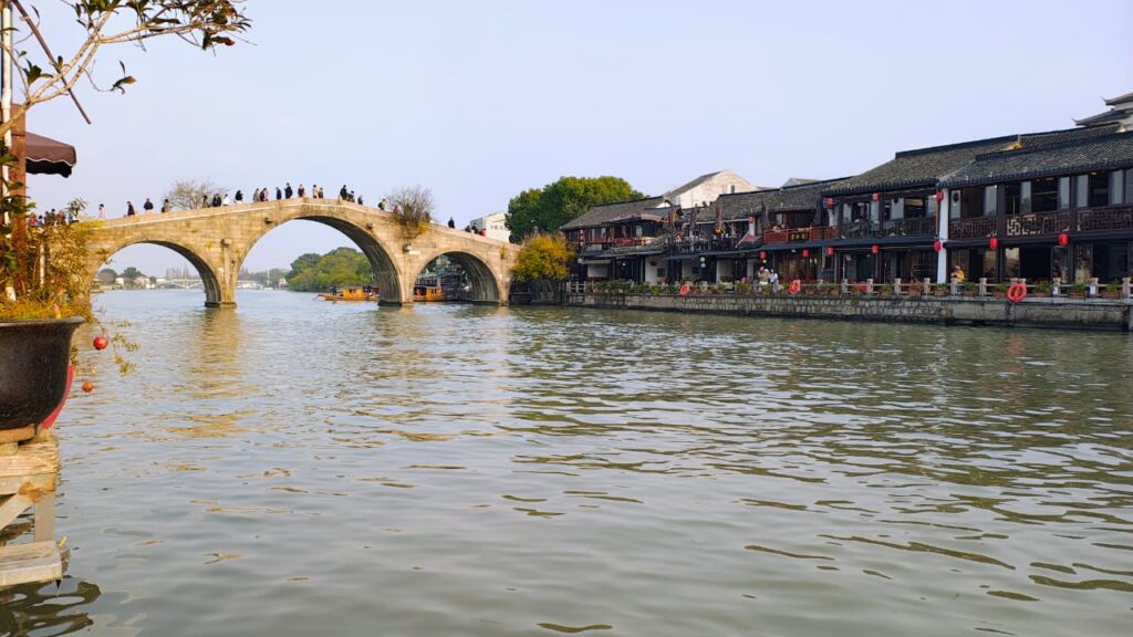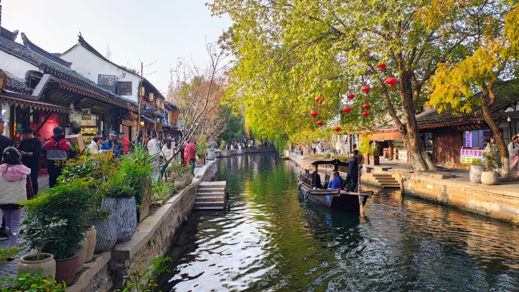 駅を出るとすぐ船乗り場があり、そこから約40元の渡し船でメインエリアまで移動できます。川の水がかなり緑色で、「これ大丈夫なん?」と若干思いましたが、とりあえず雰囲気は水郷らしくて良かったです。